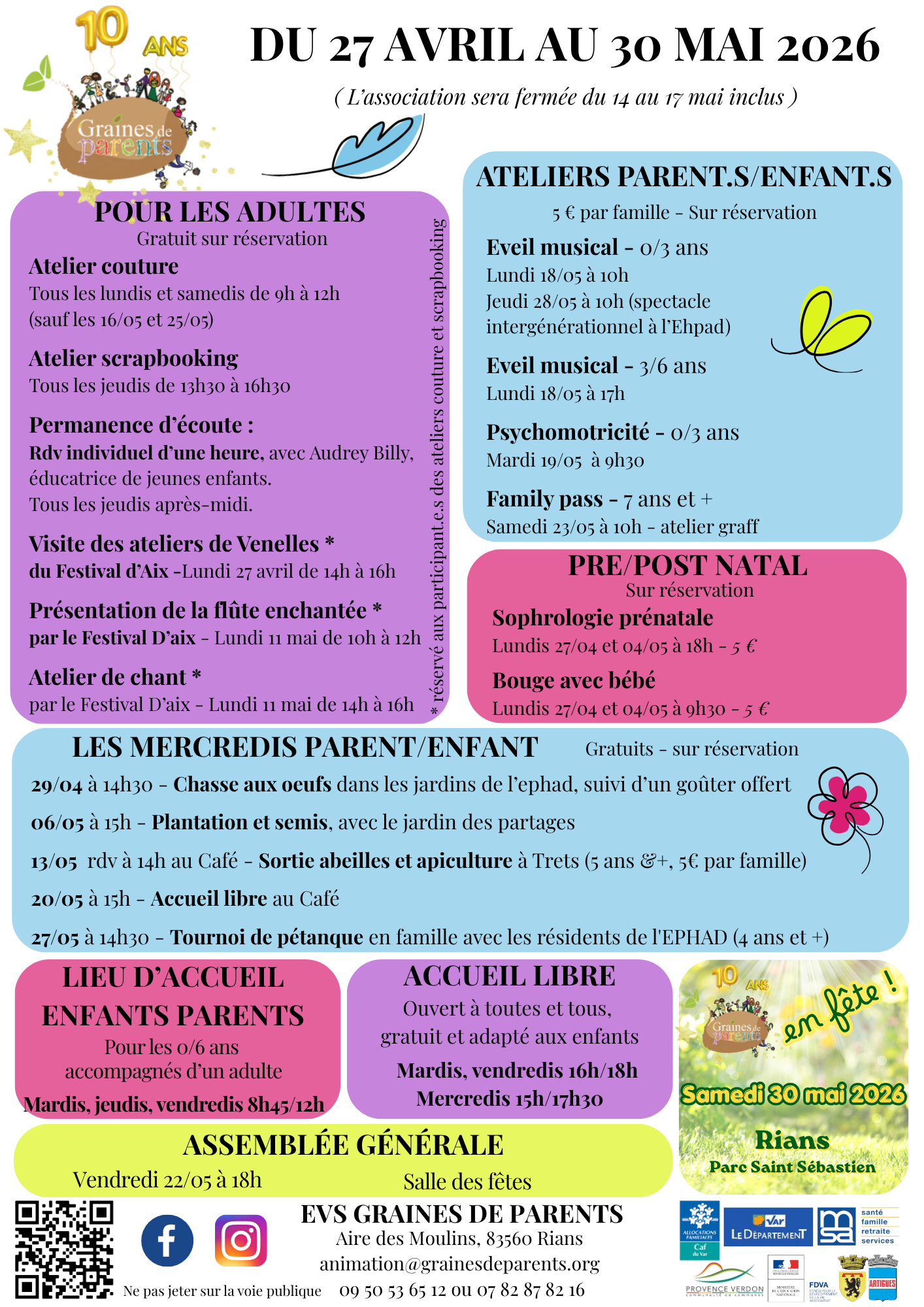 L’Association Graines de Parents a été créée en 2016 afin de permettre aux parents de Rians et du territoire de rompre avec l’isolement en se rencontrant et en échangeant sur différentes thématiques relatives à la parentalité.